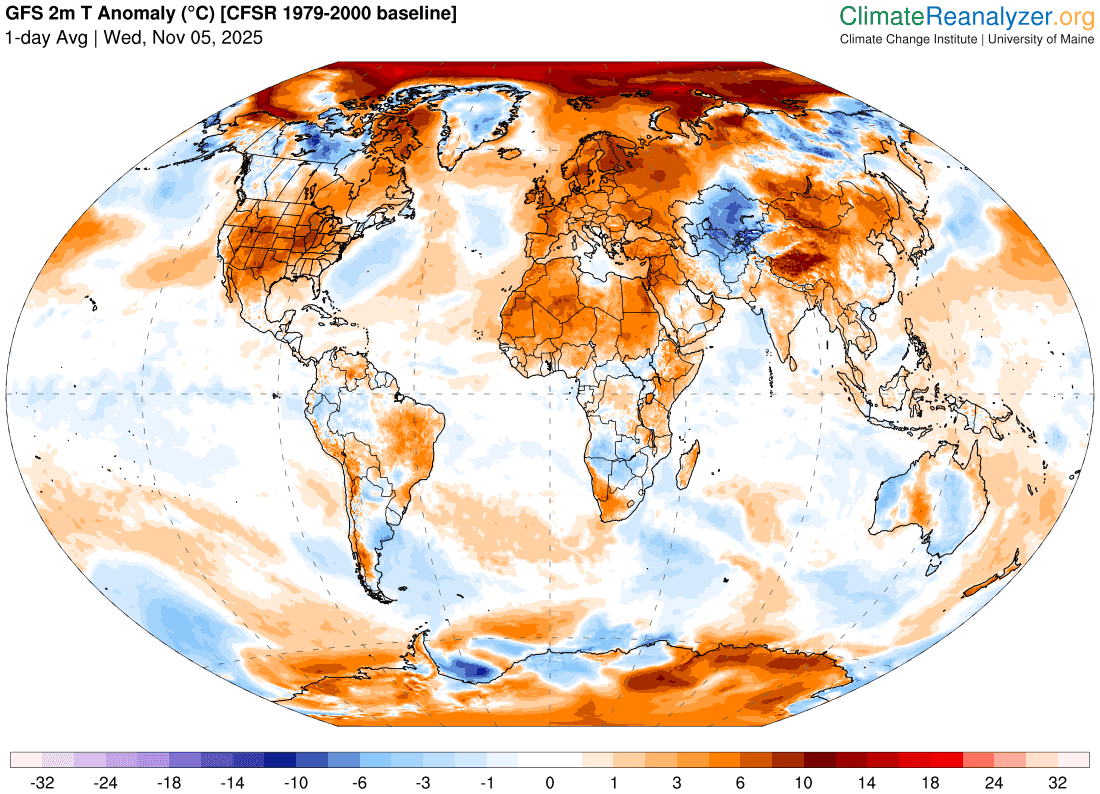 Anomalie thermique à la surface de la Terre ce mercredi 5 novembre 2025 - climatereanalyzer.org