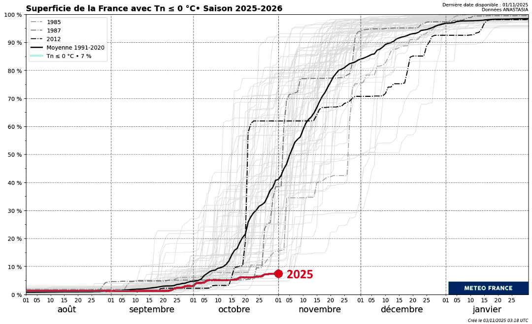 La France n'échappe pas à la règle. Alors que nous sommes désormais en novembre, de très nombreuses régions n'ont toujours la moindre gelée. En date du 1er novembre 2025, seul 10% du territoire français a déjà enregistré une température minimale égale ou inférieure à 0°C. C'est un chiffre particulièrement bas et qui figure parmi les plus bas depuis le début des mesures ! En cette saison, la normale se situe autour de 40%. Il y a donc un retard considérable, d'autant que les prévisions n'augurent toujours pas l'arrivée de gel étendu...