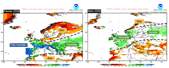 Anomalies de précipitations sur l'Europe entre février et mars 2026 – CFS