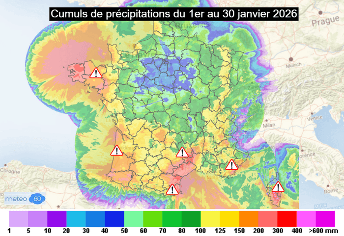 On relève ainsi sur ce mois de janvier 2026 généralement plus de 150 voire 200mm entre la Bretagne, l'Aquitaine, le Languedoc Roussillon, la Corse et une partie de la Côte d'Azur, parfois plus de 300mm sur le Finistère, les abords des Cévennes, certains secteurs de l'Aude et des Pyrénées-Orientales ainsi que les reliefs corses.