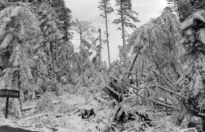 Un habitant se souvient, dans un groupe de souvenirs en ligne : « On descendait la rue sous des branches qui pliaient, prêtes à casser sous le poids de la neige. » Dans certaines rues du centre, des blocs de neige se détachent des toits et écrasent les voitures en stationnement. Par miracle, on ne déplore pas de victimes, mais plusieurs véhicules sont réduits à l’état d’épaves.