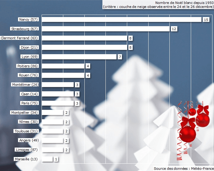 Logiquement, les probabilités d'observer un Noël blanc sont bien plus élevées dans l'est de la France que dans les régions de l'ouest ou du sud. Entre 1950 et 2022, c'est la ville de Nancy qui a connu le plus de Noëls enneigés, au nombre de 15 sur 72 (soit près de 21%). Strasbourg suit avec 12 Noëls blancs sur la période (soit 17%). À Dijon & Clermont-Ferrand, 8 Noëls ont été blancs (soit 11%). Lyon a connu 7 Noëls blancs entre 1950 et 2022. À Paris, seuls 3 des 72 derniers Noëls ont été enneigés.