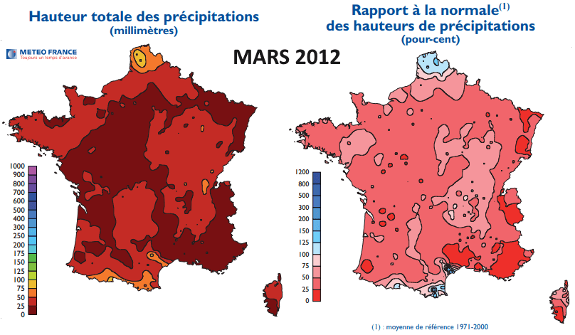Pour ne rien arranger, le début de l'année 2012 avait été particulièrement sec en France. Les mois de janvier 2012 et février 2012 avaient été dominés par les hautes pressions, affichant un déficit pluviométrique très important. Après un premier trimestre largement déficitaire en terme de pluviométrie, la sécheresse s'était alors installée de manière précoce. Celle-ci faisait la une des journaux. Les agriculteurs éprouvaient de grandes difficultés à faire démarrer leurs cultures, à l'époque où la nature est en plein essor.