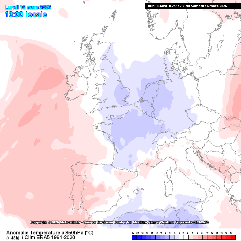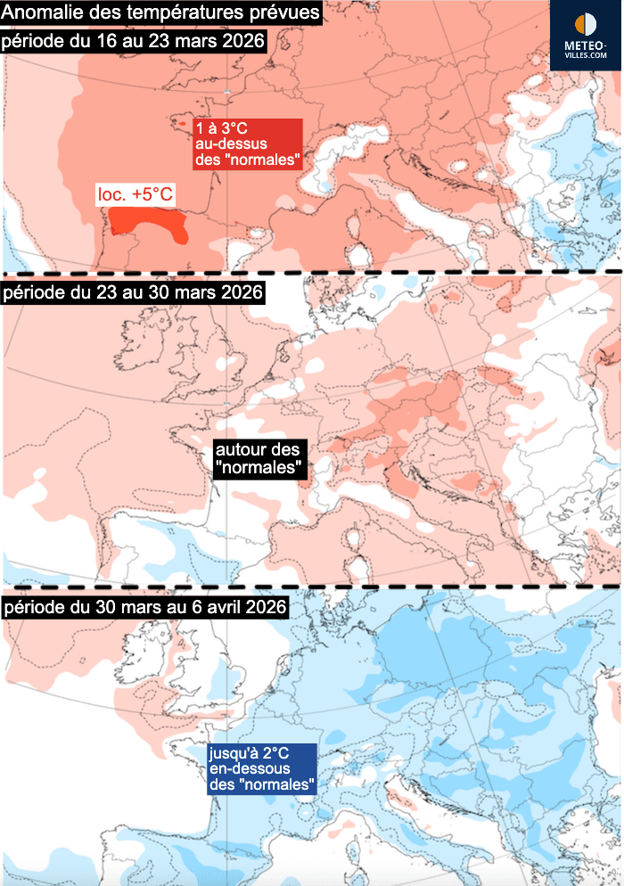 Les projections à long terme indiquent même que les températures seront inférieures aux normales de saison entre la fin mars et le début du mois d’avril.  Si ces cartes montrent des températures moyennes, certains scénarios plus isolés envisagent des coups de froid tardifs en provenance de Russie, comparables à un « Moscou-Paris » au début du printemps.  Une telle situation serait alors très préjudiciable à la végétation, actuellement très avancée, car ce type de courant continental favorise les gelées nocturnes.