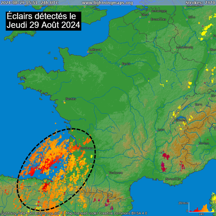 Éclairs détectés ce jeudi 29 août 2024 - via lightningmaps.org