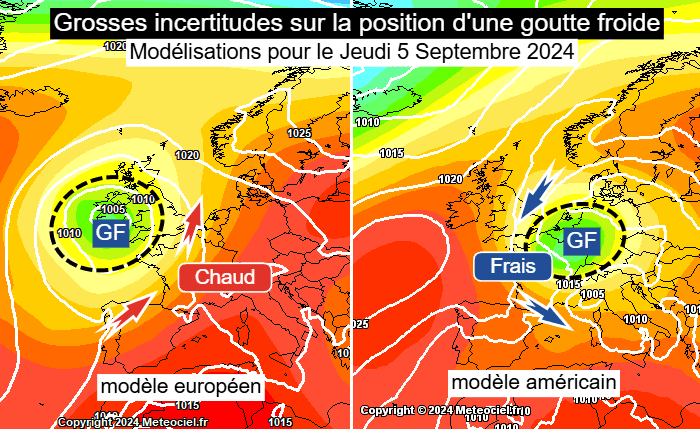 Deux scénarios très différents sur la position d'une goutte froide pour le jeudi 5 septembre 2024 - meteociel.fr