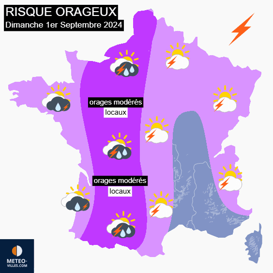 Le risque d'orages se prolongera en journée du dimanche 1er septembre. Comme la veille, les orages ne seront pas généralisés mais pourront être ponctuellement marqués entre les Pyrénées et le Pas-de-Calais, produisant des pluies intenses voire de la grêle. Notons que ces orages pourront être tardifs, se prolongeant jusqu'en nuit suivante.