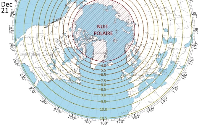 Durée de l'ensoleillement dans l'hémisphère nord lors du solstice d'hiver (21 décembre) - via Celtabria sur Reddit