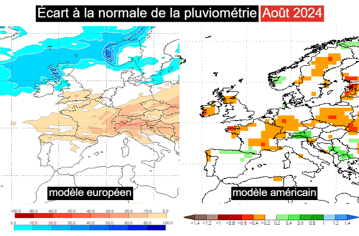 Anomalie pluviométrique en août 2024 selon les modèles européen et américain - ECMWF et NOAA