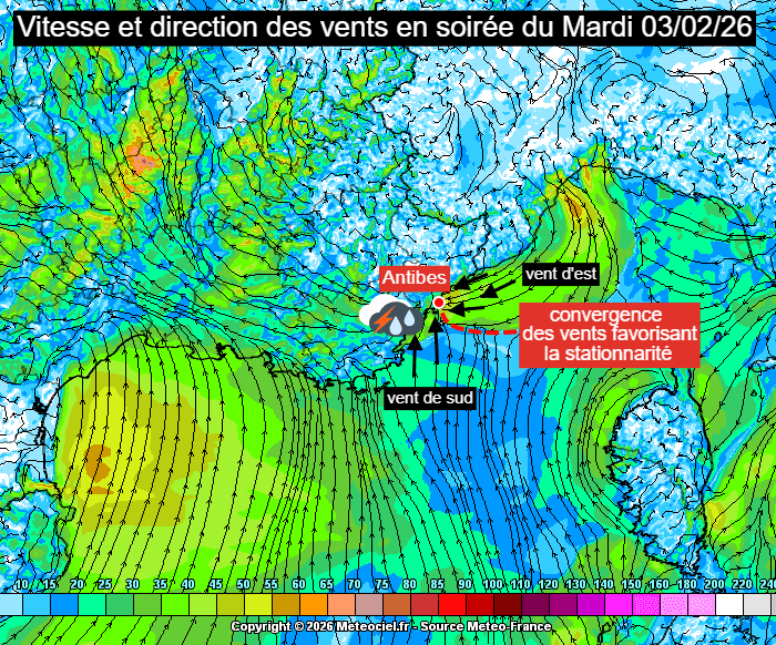 Le contexte est actuellement dépressionnaire en Méditerranée et l'air doux qui s'ajoute amplifie l'instabilité. En cette soirée du mardi 3 février 2026, toutes les conditions étaient réunies pour l'observation d'un orage stationnaire sur la côte d'Azur. En effet, une convergence des vents s'est mise en place sur Antibes. Cela signifie qu'un vent d'est concernait le littoral des Alpes-Maritimes tandis qu'un vent de sud soufflait sur le littoral varois. Ces deux vents se rencontraient à Antibes. Cette convergence a perduré plusieurs heures, donnant à l'orage son énergie et son caractère stationnaire.