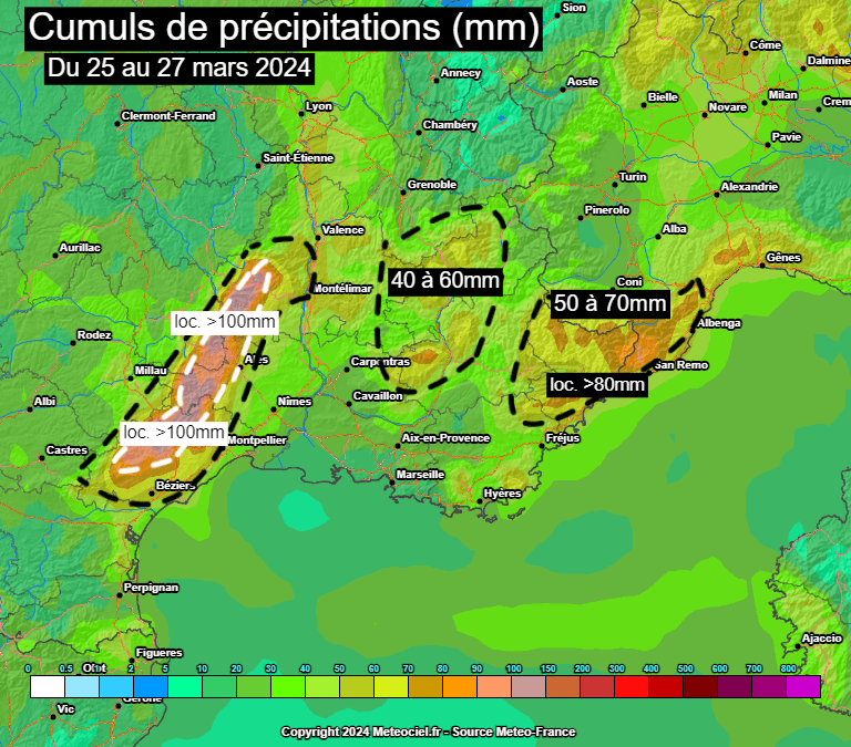 Ce nouvel épisode s'annonce plus modéré que les précédents. des cumuls de l'ordre de 50 à 70mm sont attendus en règle générale dans les zones les plus favorables (aux pieds des Cévennes, près des reliefs Alpins et du relief Corse). Ces cumuls pourront localement dépasser les 100mm dans les Cévennes notamment en Ardèche et dans le Gard.