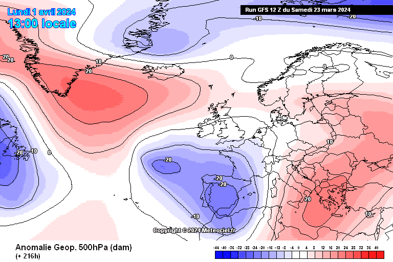 Anomalies de z500 (basses en bleu, hautes en rouge) au 1er avril en Europe et Atlantique Nord - GFS via Meteociel