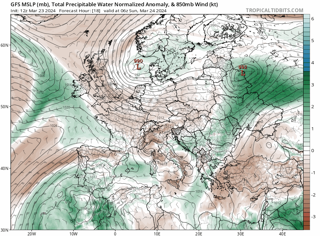 Apports d'humidité (eau précipitable) en vert via la goutte froide des Canaries, reprise par la circulation Atlantique sur le bassin méditerranéen - TropicalTidbits