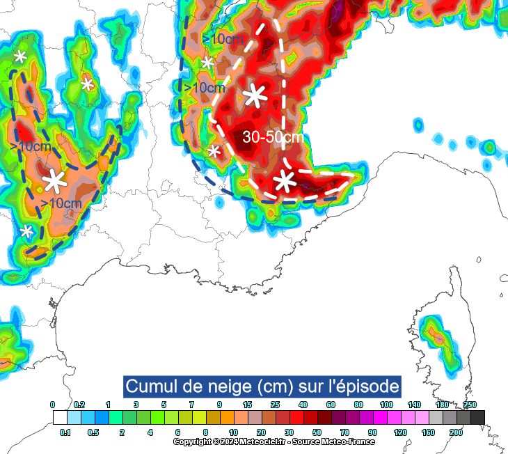 Cumul de neige attendu sur l'épisode total, en cm - Carte Meteociel, annotations MeteoVilles