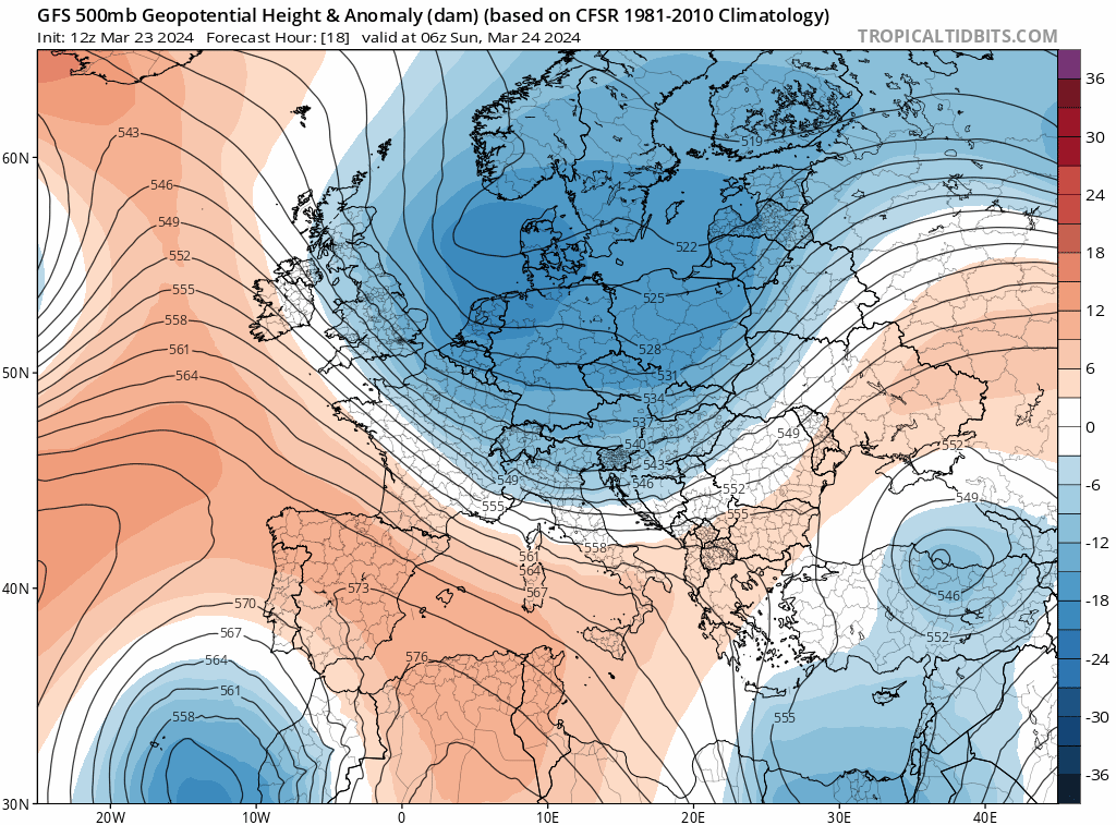 Les zones dépressionnaires (en bleu, anomalie basse de Z500) Atlantiques poussent la goutte froide des Canaries en direction de la Méditerranée, induisant un flux fortement dépressionnaire sur ces régions - TropicalTidbits