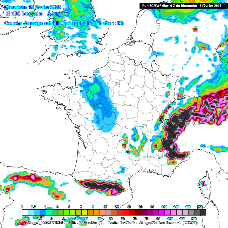 Épaisseurs de neige maximales prévue pour le dimanche 15 février 2026 (réactualisation de dimanche 6h) – Météo-Villes