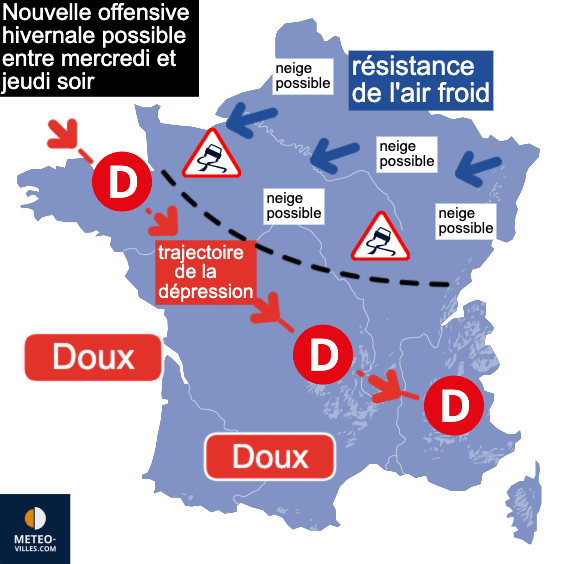 Après le redoux de dimanche après-midi, l’air froid reprendra rapidement le dessus sur la moitié nord dès le début de la semaine.  Une dépression, déviée vers le sud par l’air froid persistant au nord, devrait s’échouer sur la France entre mercredi soir et jeudi.  Les précipitations, sous cet air froid, pourraient se transformer en neige.  Il est cependant encore trop tôt pour déterminer précisément les régions concernées.  Des chutes de neige significatives sont possibles, avec un risque accru entre la Normandie, l’Île-de-France et toutes les régions situées au nord de la Seine.