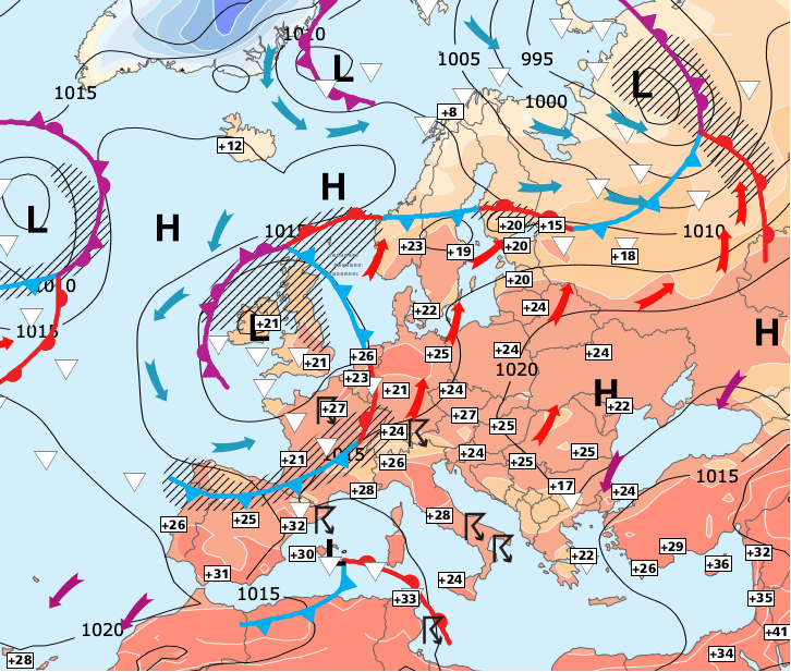 + La dépression située sur les îles britanniques occasionne un temps instable sur nos régions. Mais comme la chaleur reste assez présente à l’arrière du front froid, la situation est anarchique (si bien que les zones d’averses sont difficilement prévisibles).