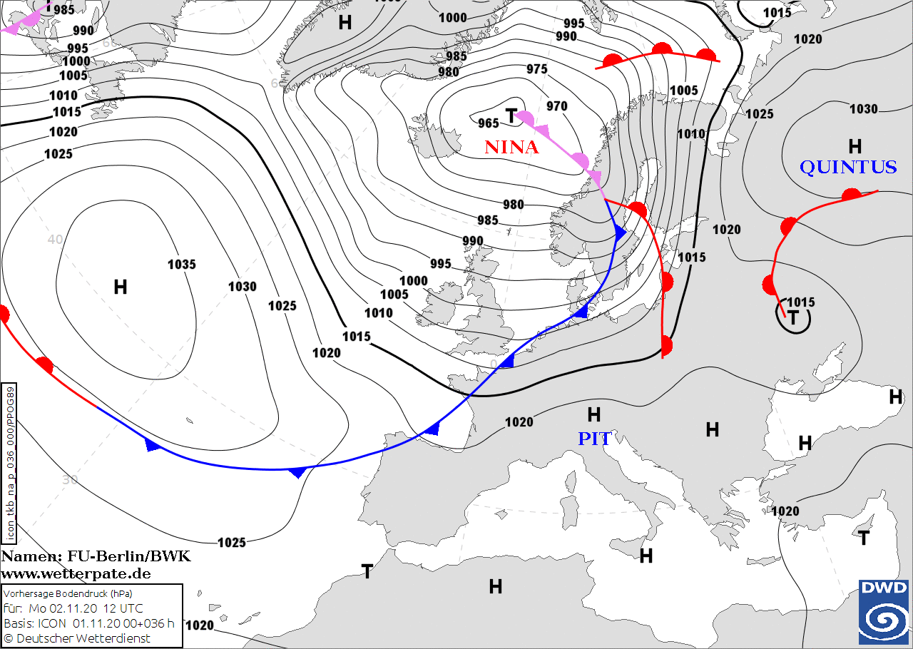 Noms des dépressions et anticyclones prévus pour lundi 2 novembre 2020 à midi (Berlin)