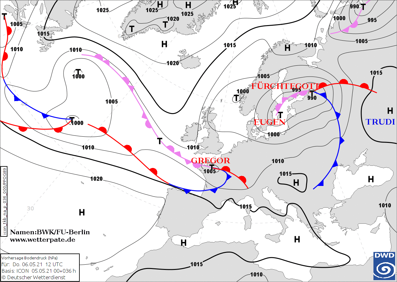 Noms des dépressions et anticyclones prévus pour jeudi 6 mai 2021 à midi (Berlin)