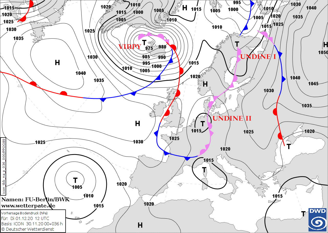 Noms des dépressions et anticyclones prévus pour mardi 1er décembre 2020 à midi (Berlin)