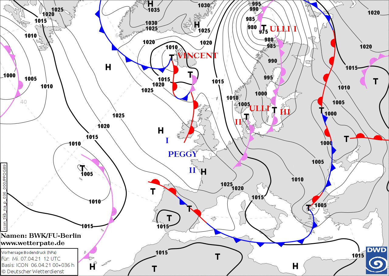 Noms des dépressions et anticyclones prévus pour mercredi 7 avril 2021 à midi (Berlin)