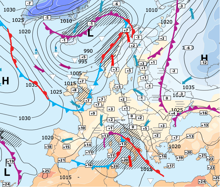 + Cette fin de semaine sera en effet très agitée ! Une vaste et profonde dépression centrée sur le Nord de la France provoquera énormément d’agitation avec des pluies parfois soutenues, des vents forts et des chutes de neige abondantes en montagne.