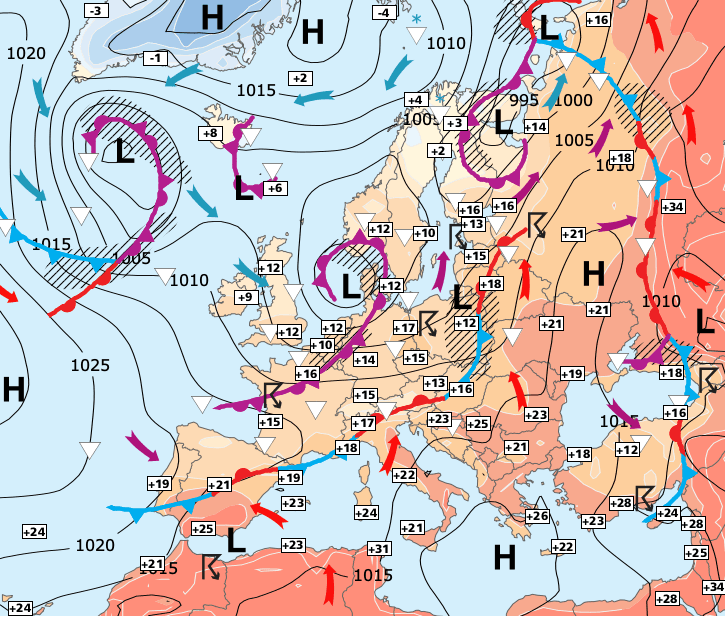 + La goutte froide d'altitude qui ralentira l’amélioration sur les régions du Nord devrait très lentement se décaler vers la Scandinavie dans les derniers jours du mois de mai - "libérant" ainsi toute la France...