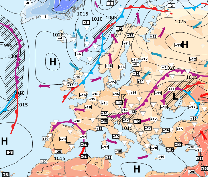 + À partir de dimanche, une dépression ibérique engendrera des remontées nuageuses puis instables sur une petite moitié Sud en début de semaine prochaine.