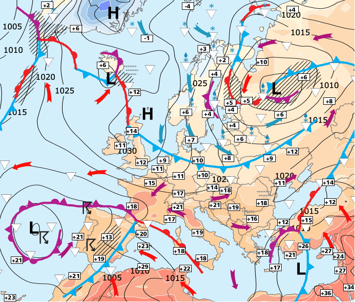 + La France est soumise à deux influences diamétralement opposées : Avec une descente fraîche mais sèche en provenance d’Allemagne sur les régions du Nord, et une remontée humide mais plus chaude sur les régions du Sud.