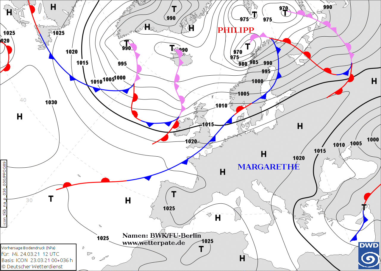 Noms des dépressions et anticyclones prévus pour mercredi 24 mars 2021 à midi (Berlin)