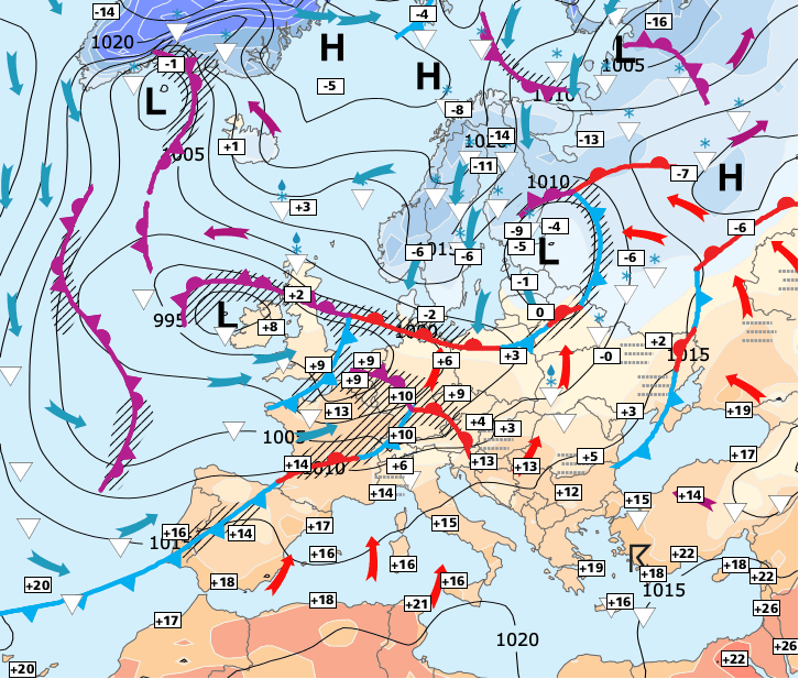 + On surveillera toujours l'évolution de la masse d'air froide originaire de Scandinavie car tout au long de la semaine prochaine, la limite se trouvera au niveau de l’Angleterre (et pourrait même descendre jusqu'à Londres ou la Normandie).
