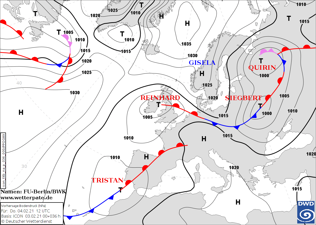 Noms des dépressions et anticyclones prévus pour jeudi 4 février 2021 à midi (Berlin)