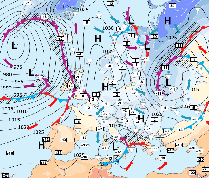 + L'influence de l'anticyclone polaire de Scandinavie nous vaut un temps plus calme, plus sec et toujours froid sur une grande moitié Nord.