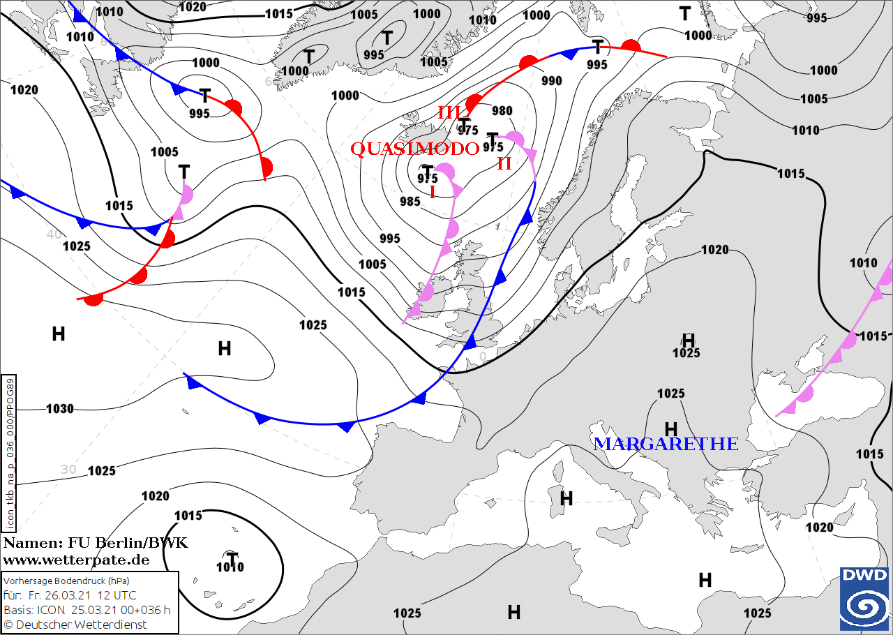 Noms des dépressions et anticyclones prévus pour vendredi 26 mars 2021 à midi (Berlin)