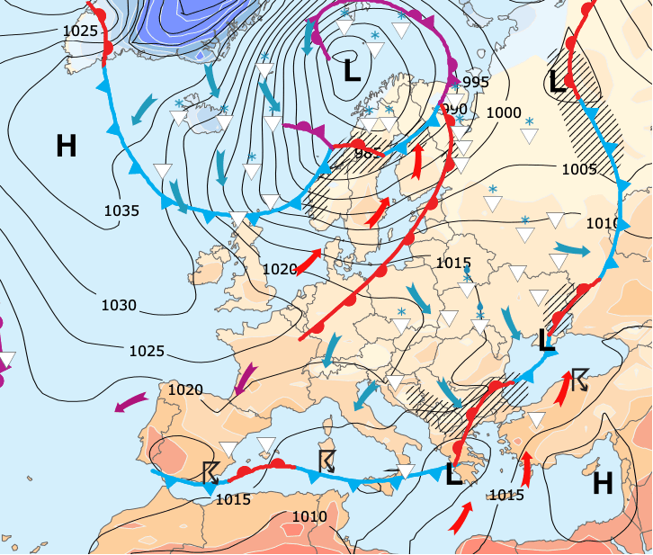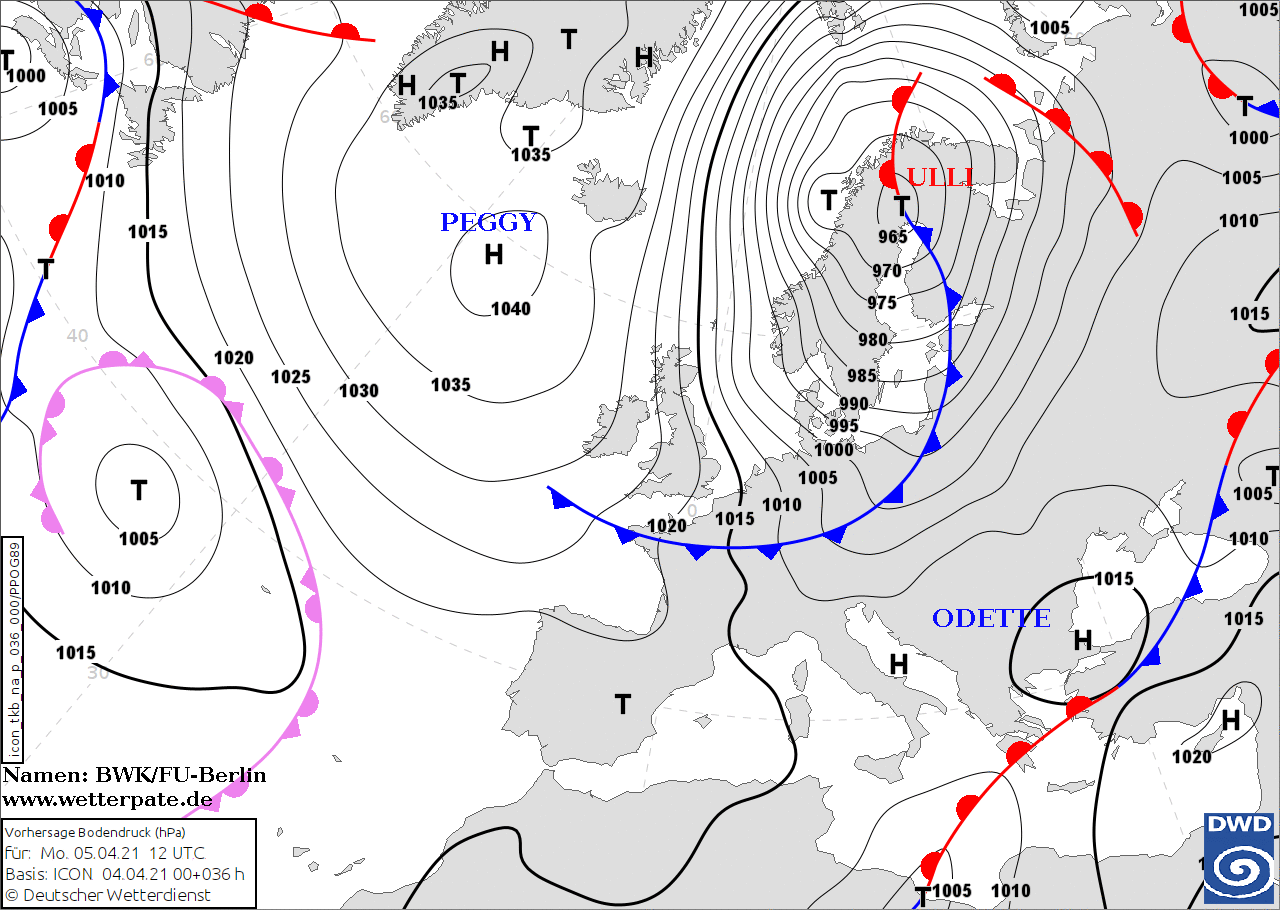 Noms des dépressions et anticyclones prévus pour lundi 5 avril 2021 à midi (Berlin)
