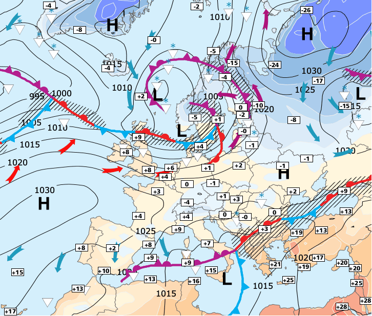 Noms des dépressions et anticyclones prévus pour mardi 12 janvier 2021 à midi (Berlin)