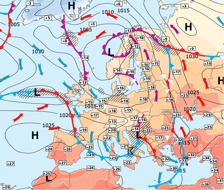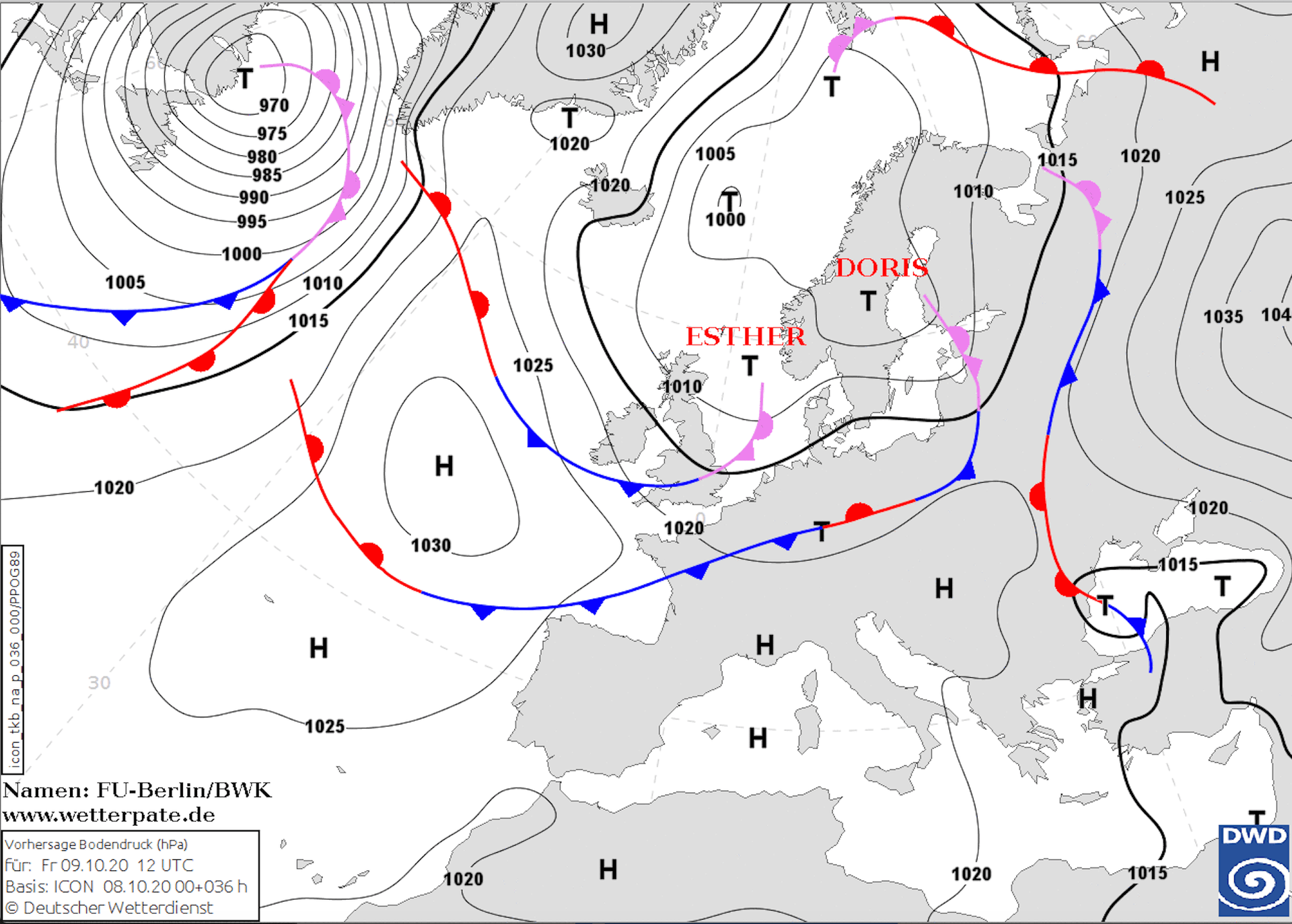 Noms des dépressions et anticyclones prévus pour vendredi 9 octobre 2020 à midi (Berlin)
