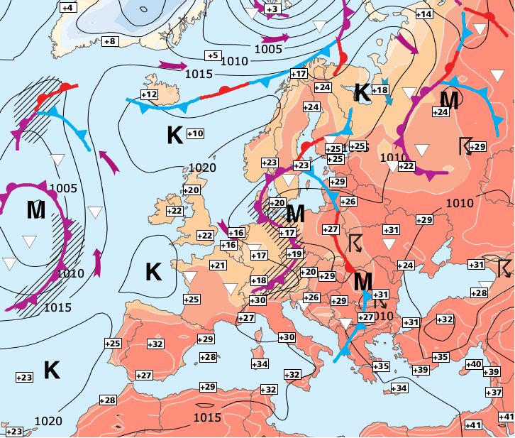 Noms des dépressions et anticyclones prévus pour vendredi 2 juillet 2021 à midi (Berlin)