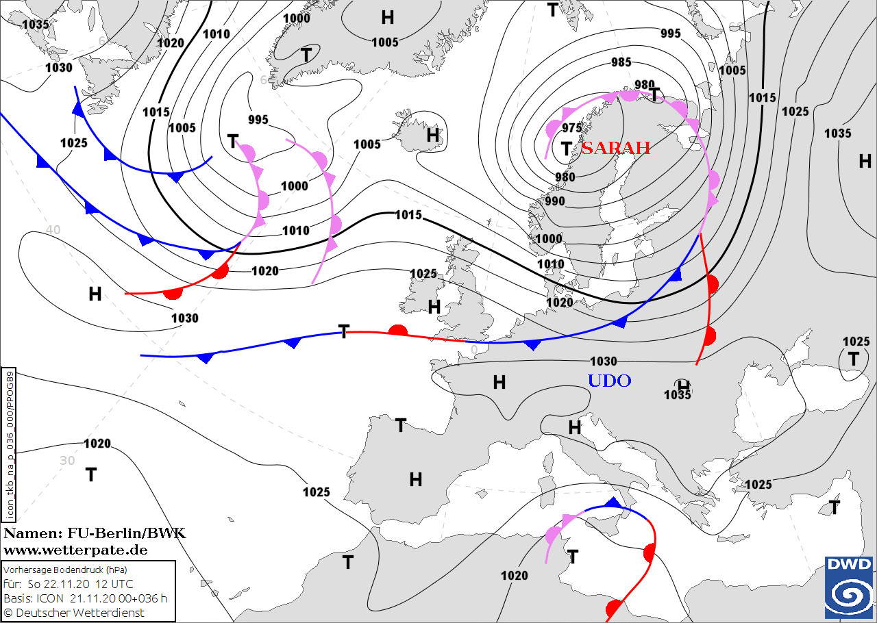 Noms des dépressions et anticyclones prévus pour dimanche 22 novembre 2020 à midi (Berlin)