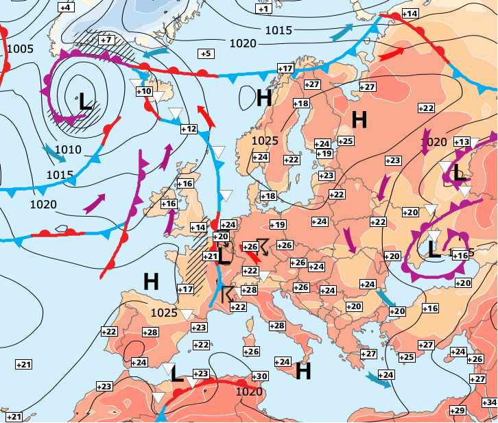 + L’air océanique plus stable et moins chaud gagnera donc une bonne partie de la France, et le risque d’orages se cantonnera à l’Alsace et à la Franche-Comté.
