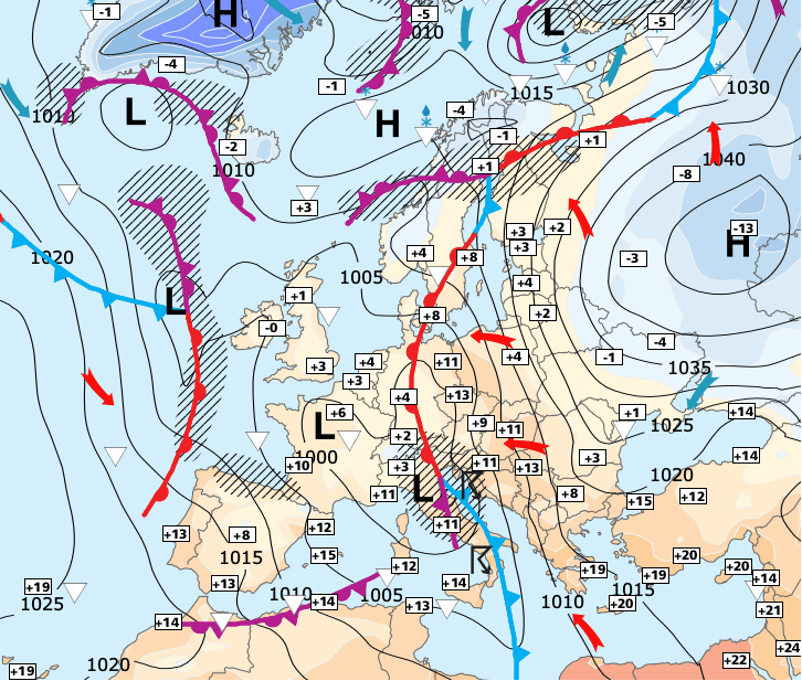 + La descente froide qui affecte toute l’Europe occidentale et concerne également l’Afrique du Nord (neige en Algérie) ne se décalera que lentement vers l'Est de ici à la fin de la semaine.