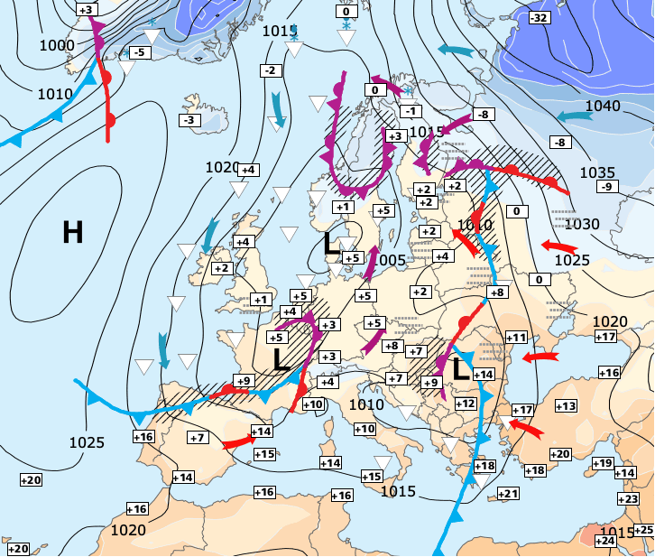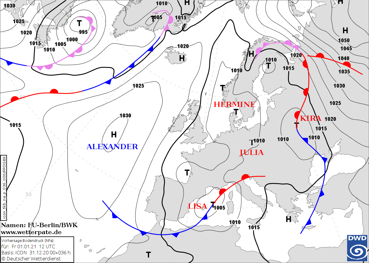 Noms des dépressions et anticyclones prévus pour vendredi 1er janvier 2021 à midi (Berlin)
