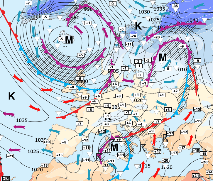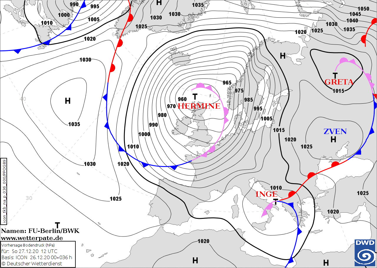 Noms des dépressions et anticyclones prévus pour dimanche 27 décembre 2020 à midi (Berlin)