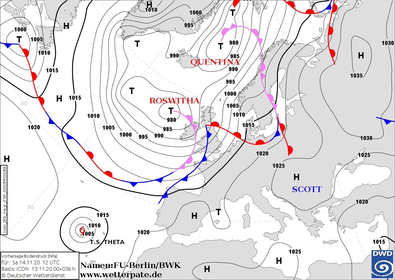 Noms des dépressions et anticyclones prévus pour samedi 14 novembre 2020 à midi (Berlin)