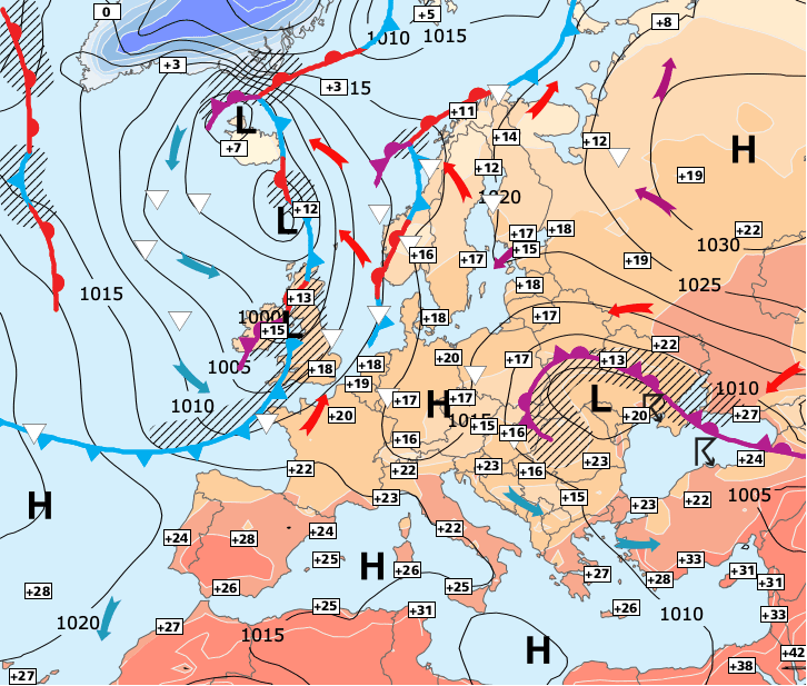 Noms des dépressions et anticyclones prévus pour jeudi 1er octobre 2020 à midi (Berlin)