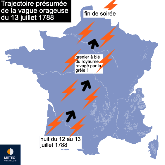 Le 13 juillet 1788, Une vague orageuse d’une ampleur et d’un force rarement observée traverse la France du sud-ouest au nord-est, provoquant l’une des plus grandes catastrophes agricoles de la fin de l’Ancien Régime. Ce phénomène, assimilable aujourd’hui à une supercellule de grêle, a eu un impact national, économique, social et politique.